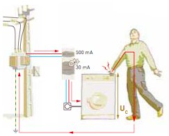 Dans le cas d'un contact indirect et si l'appareil en question est relié à une bonne prise de Terre, alors l'interrupteur différentiel mettra en sécurité l'installation avant que le choc électrique ne se produise. Si la Terre de l'installation n'est pas bonne ou inexistante alors seul un différentiel 30mA pourra sauver la personne mais il n’empêchera pas le choc...