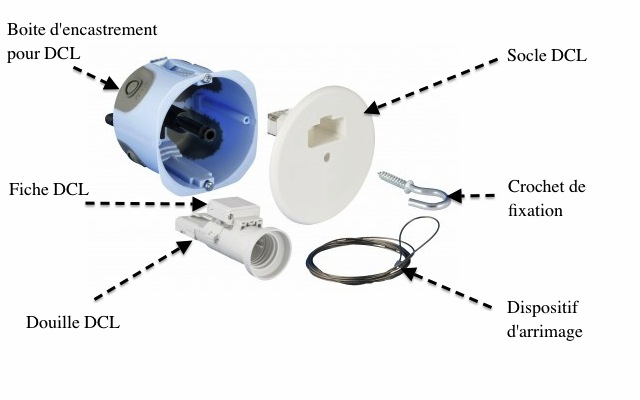 Il existe aussi des boîtes DCL pour une pose en applique. Elle sera composée seulement de la boite d'encastrement et du socle DCL. Effectivement il n'y a pas besoin de tous les accessoires de sécurisation de la charge étant donné que la fixation est murale... Ces boitiers d'applique existent aussi en petit diamètre pour qu'ils soient plus discrets.