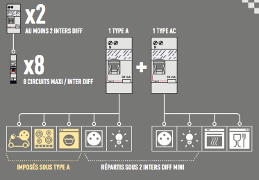 • Les circuits éclairage et prise de courant doivent être répartis sous au moins 2 interrupteurs différentiels. Ceci a pour but d'assurer une continuité de fonctionnement.