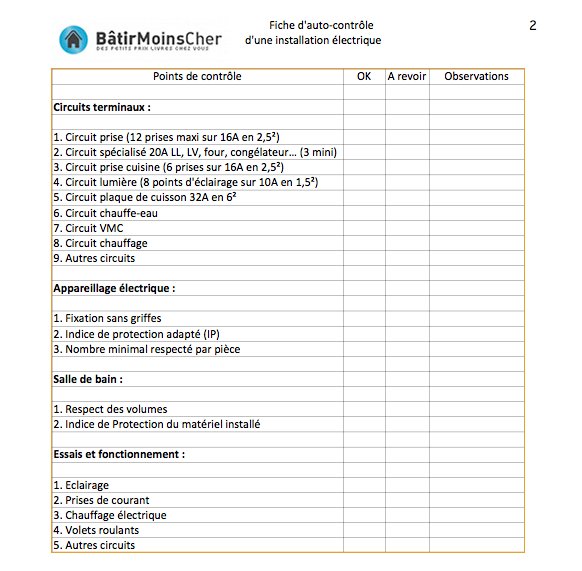 Il vérifie la conformité de l'installation électrique par rapport à la norme NF C 15-100. Pour vous aider à y voir plus clair, Bâtir Moins Cher a conçu pour vous une fiche d'auto-contrôle. Le tableau électrique, la prise de Terre, section des fils électriques, l'appareillage électrique, la salle de bain... Tout y passe ! Les électriciens connaissent la NF C 15-100 sur le bout des doigts... Mais ce n'est pas aussi évident dans le cadre d'une auto-construction.