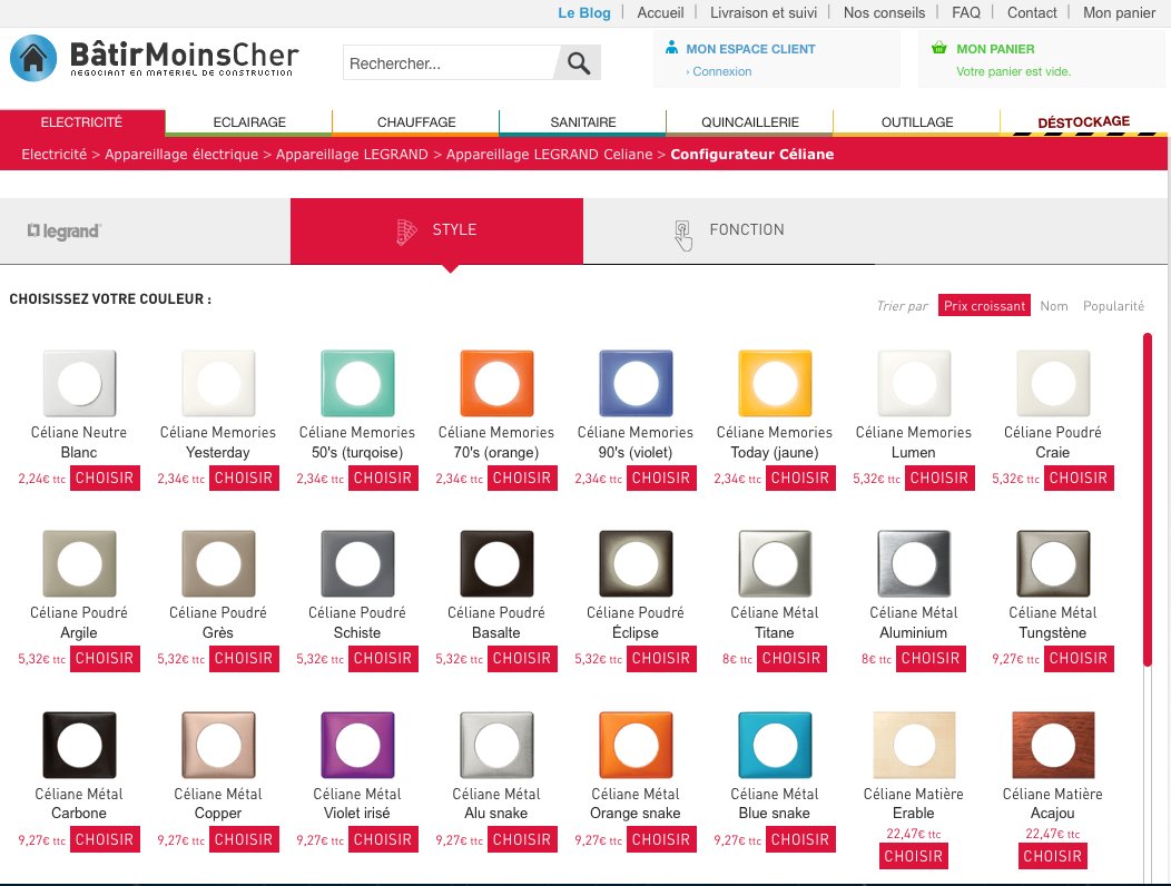 Bâtir Moins Cher vient d'éditer en ligne le tout nouveau configurateur Legrand Celiane ! En vous rendant tout simplement sur le site www.batirmoinscher.com vous accéderez facilement en quelques clics au configurateur Celiane. Voyons ensemble comment cela facilite la commande de votre appareillage électrique...