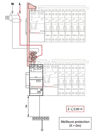 Le parafoudre s'installe à l'origine de l'installation électrique, en aval du dispositif différentiel 500mA et il doit être relié directement à la terre. Son emplacement dans le tableau doit être définie pour que la connexion à la terre soit inférieure à 50cm.