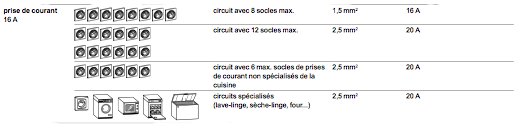 Avant, un circuit prise comportait 8 socles de prises. Aujourd'hui un circuit prise protégé par un disjoncteur 16A câblé en 2,5mm² est composé de 12 prises de courant. Par contre, avant, une prise double valait un socle, aujourd'hui 1 prise double vaut 2 prises de courant. La NF C 15-100 a donc visiblement simplifiée le calcul des prises de courant qui peuvent être protégées par un même circuit. Pour les prises de courant de la cuisine, le disjoncteur de 16A sera limité à protéger 6 prises de courant. Les circuits spécialisés restent inchangés avec un disjoncteur de 20A et du fil électrique en 2,5mm² pour le lave-linge, le four, le lave-vaisselle, le sèche-linge...