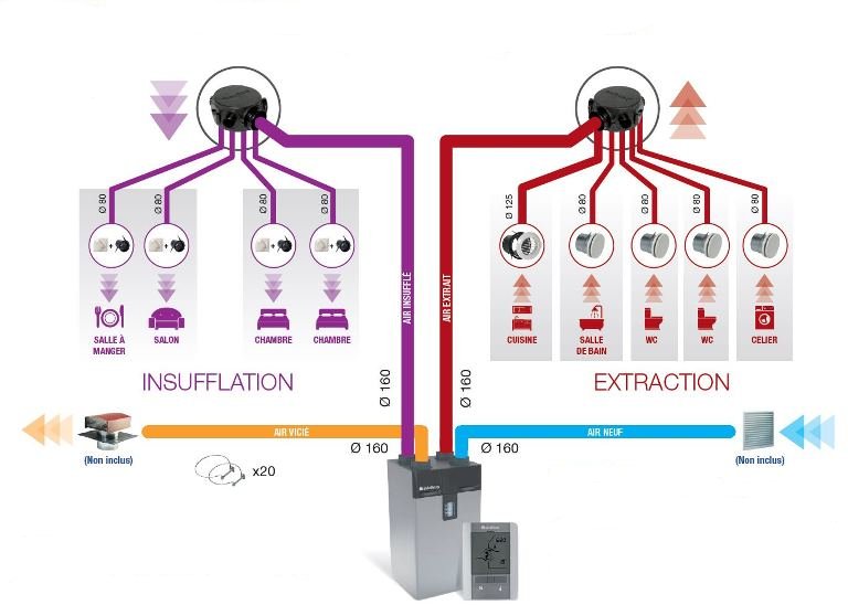 - Un système de By-pass permet à l'air entrant de ne pas passer par le caisson de réchauffement. C'est utile la nuit en été, lorsque l'air extérieur est plus frais que l'air à l'intérieur de la maison... De fait, l'air chaud est aspiré et de l'air frais est insufflé dans les chambres et les pièces de vie. La VMC double flux sert ainsi de "climatisation" !